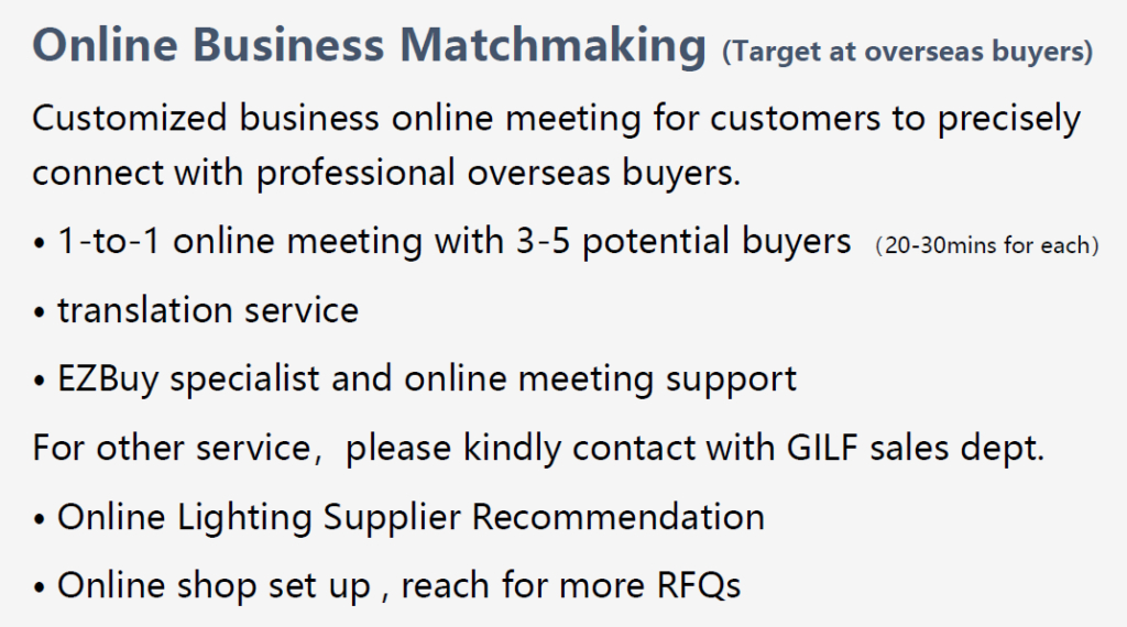 This comprehensive tailored service helps global buyers to identify and screen potential Denggle business partners. We will arrange personalized one-on-one onsite meetings or online group chat for suppliers and buyers.